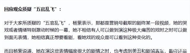 面对这样的抹黑,杨紫没有气急败坏,反而冷静地回应:那些都是情绪特别激动时的片段,我不信有人演极大痛苦的戏能面无表情。